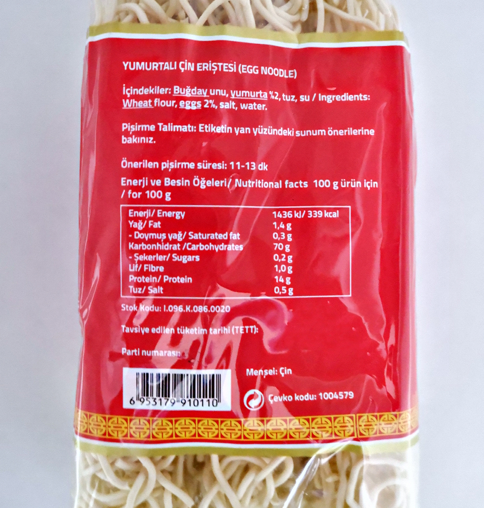 Bu erişte, temel olarak buğday unu, %2 oranında yumurta, tuz ve suyun birleşimiyle oluşur. Yumurta içeriği sayesinde zengin bir aroma ve yüksek bir doku kazanır. Ayrıca, ürünün enerji değeri 1436 kJ/339 kcal olup, sağlıklı bir beslenme programına uygun şekilde tasarlanmıştır.