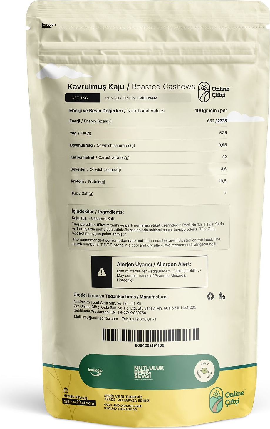 Online Çiftçi tarafından sunulan Kavrulmuş Kaju, Vietnam menşeli ve yüksek kalite standartlarına uygun olarak ithal edilen bir kuruyeğidir. Paket içeriğinde büyük taneli ve özenle kavrulmuş kajular bulunur. Ürün, Türk Gıda Kodeksi'ne uygun şekilde el değmeden paketlenmiş olup, tazeliğini uzun süre koruyan özellikleriyle dikkat çeker. Kavrulma işlemi, ürünün doğal aromasını ve çıtırlığını ön plana çıkaracak şekilde yapılmıştır. Ayrıca, ürün görsellerinde de görülebileceği gibi, altın rengini muhafaza eden taneler, yüksek kaliteyi yansıtır.